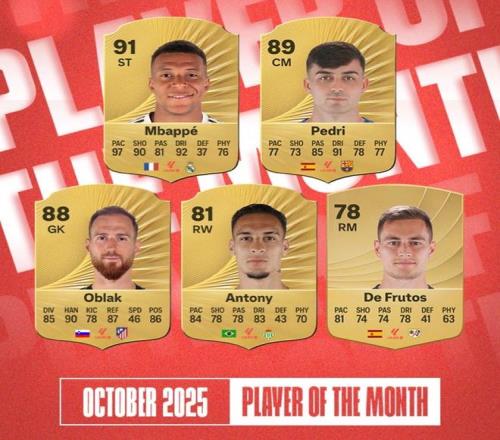 雷速体育10月22报道 西甲官方公布了10月最佳球员的五位候选人,姆巴佩连续三个月进入提名,佩德里、安东尼在列。