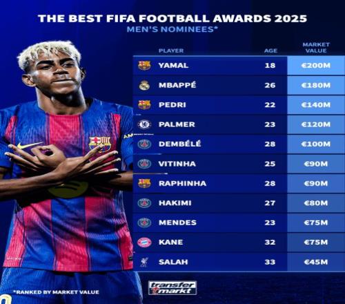 FIFA最佳球员候选身价:亚马尔2亿领跑萨拉赫凯恩垫底