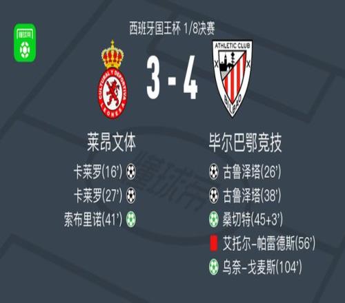 北京时间1月14日西班牙国王杯 1/8决赛,莱昂文体对阵毕尔巴鄂竞技。莱昂文体卡莱罗梅开二度,索布里诺破门。毕尔巴鄂竞技古鲁泽塔梅开二度,桑切特破门,乌奈-戈麦斯破门。最终比分莱昂文体 3-4 毕尔巴鄂竞技。