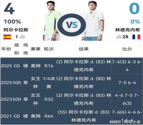 2023年ATP500伦敦女王杯第一轮,林德克内希惨遭阿尔卡拉斯逆转击败。还是草地菜鸟的阿尔卡拉斯此战之后仿佛突然在草地赛场开窃了,最后连胜五场夺取女王杯冠军,一举完成从草地菜鸟到草地冠军的华丽转身。2025年伦敦女王杯1/4决赛,阿尔卡拉斯两盘战胜林德克内希,最后第二次夺取女王杯冠军。
