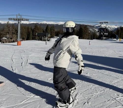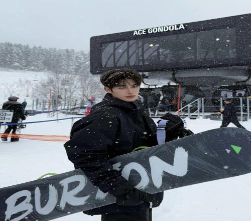 张乐康身着牛仔雪服,内搭针织毛衣,随性又不失质感。同色系棕色雪靴与手套相互呼应,将冬日运动穿搭的舒适与格调完美融合。