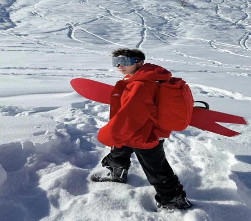 茫茫雪场里中的 “一点红”,热烈如火,在纯白天地间肆意生长,青春本就该自在驰骋、大胆耀眼。