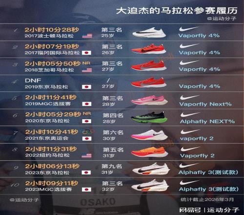 他的马拉松生涯也正好与厚底泡棉+碳板的超级跑鞋时代同时开启,穿着Vaporfly 4%、Vaporfly Next%、Vaporfly 2、Alphafly NEXT%、Alphafly 3创造出不少好成绩。
