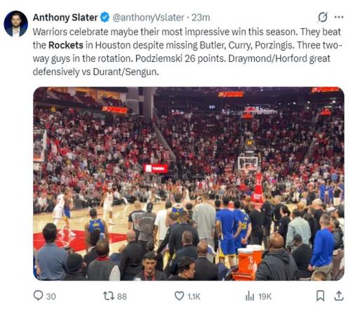 勇士记者安东尼-斯莱德:勇士或许迎来本赛季最瞩目的胜利。失去了巴特勒、库里、波尔津吉斯他们客场还是能击败西部第三的火箭。替补阵容的三位多面手发挥了重要作用,追梦/霍福德防守端发挥出色成功限制了申京与杜兰特。