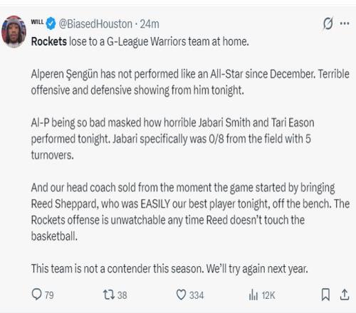 他继续写道:火箭队在主场输给了发展联盟的勇士!申京自12月以来表现一直都没有达到全明星水准此役攻防都糟糕;