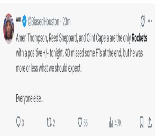 休媒Will:阿门、谢泼德、卡佩拉是今晚火箭正负值为正的三人,虽然KD在决胜时刻罚丢了一个球但他的表现基本符合我们的预期,但其他人就..........
