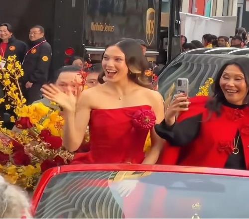 巡游途中,谷爱凌身穿一袭红色礼服亮相,坐在一辆装饰着鲜花的红色敞篷车上向沿途观众挥手致意。红色在中国传统节日中象征吉祥与繁荣,也成为当晚巡游中最醒目的色彩之一。