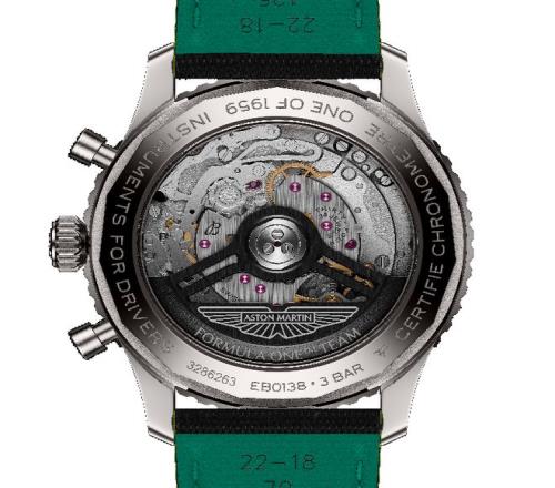 翻到表背,透明蓝宝石水晶底盖下是这枚表的“引擎”,你能直接看到百年灵自制01机芯的运转。其中最醒目的当然是那枚专为此版打造的哑光黑色摆陀,覆有高耐久性PVD涂层的钨打造,并饰有Aston Martin Formula One™ Team标志。