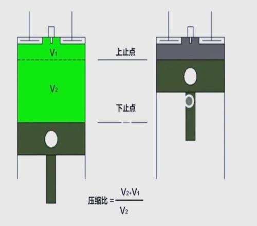 2026 年的 F1 新规,把发动机的压缩比( 也就是气缸内膨胀和压缩行程对应的混合气体积比,如下图 )从原先的 18:1 降到了 16:1。