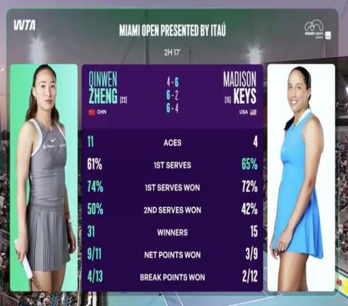 郑钦文在这场比赛贡献了11记ACE球,打出了31记制胜分,而且挽救了10个破发点,总体表现非常不错。对于击败凯斯,郑钦文赛后表示:“一开始她的球就像炮弹一样,我根本反应不过来。我已经很久没有打过这么快的比赛了。我花了好长时间才适应。我真的很喜欢在迈阿密比赛,尤其是在你们所有人面前。我希望我能在这走得更远。我真的很喜欢这里。”