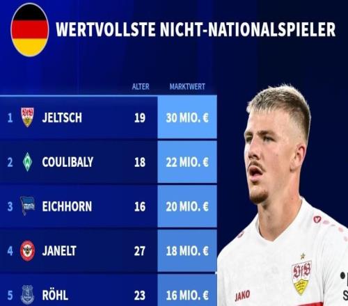 从未入选德国队球员身价榜:斯图加特后卫耶尔奇3000万欧居首 -