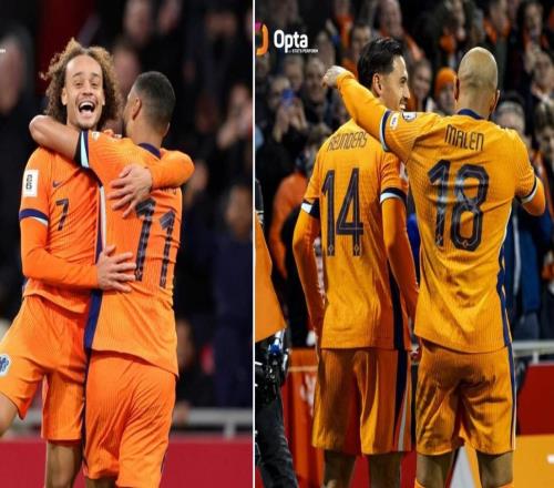 荷兰队史首次,四名来自英超的球员单场比赛分别进球 -